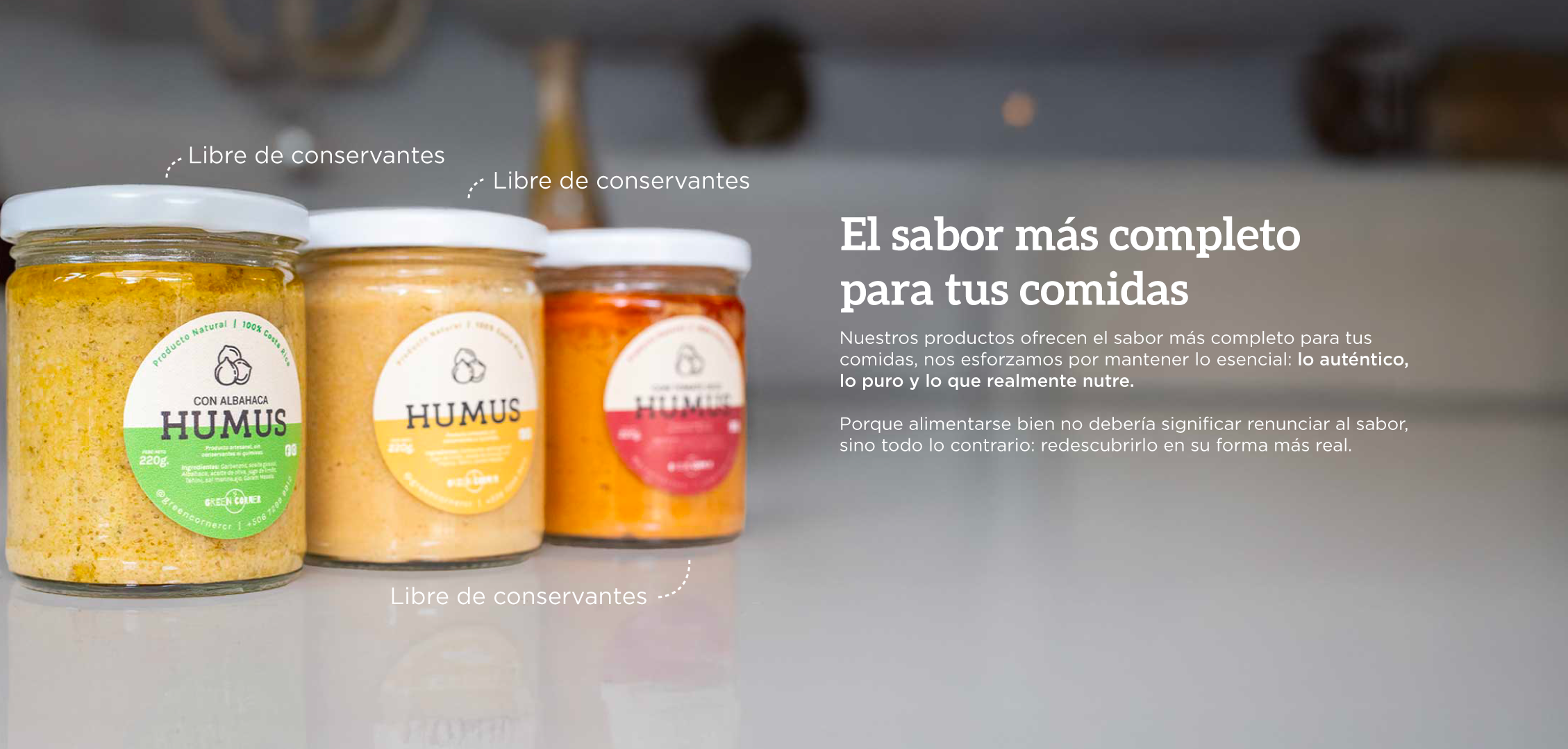 - Salsas artesanales: Hummus, pesto, chimichurri y más.
